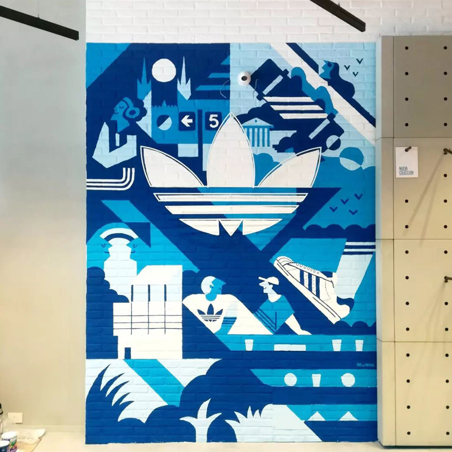 ENG. Mural for Adidas Originals store in La Plata. In order to make the illustration, some key points of the city were taken as reference, such as the Curutchet House, the Museum of Natural Sciences and the Cathedral, along with its numerous parks and its university and urban life. Its style and composition is strongly inspired by the diagonal and geometric layout of La Plata, which is very characteristic.