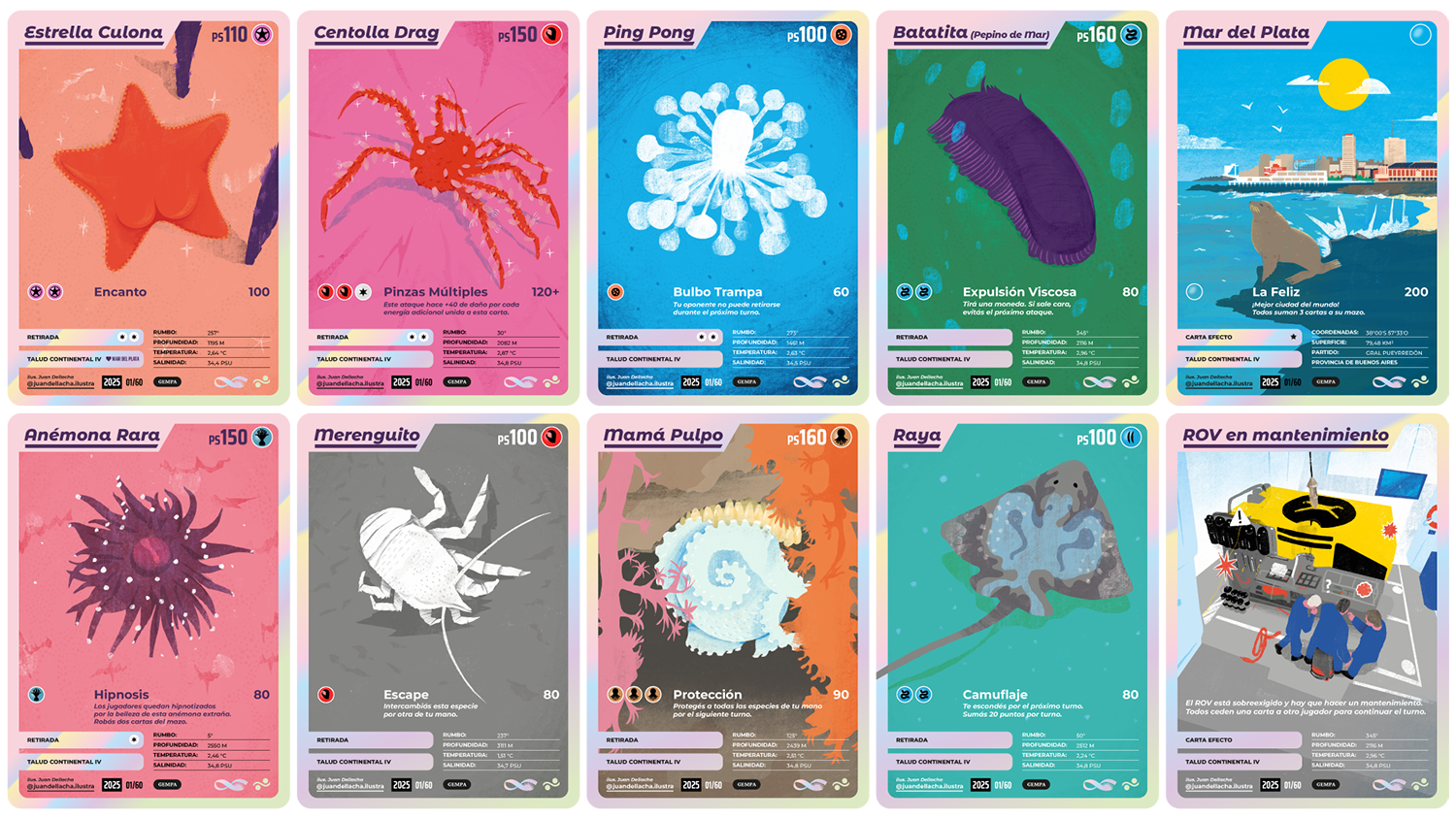 ESP. Set de cartas inspiradas en la expedición y descubrimientos de la expedición Talud Continental IV en el Cañón de Mar del Plata, destacada como una exploración de alta tecnología en la provincia de Buenos Aires, Argentina; llevada adelante por el GEMPA, un grupo de científicos e investigadores del Conicet.