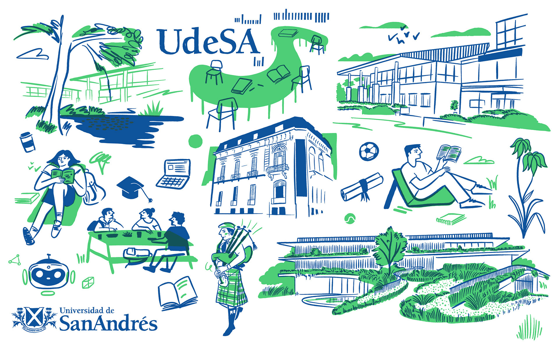 ENG. Welcome kit for Universidad de San Andres students. Illustration series for totebags, notebooks, stickers, enamel pins, mugs.