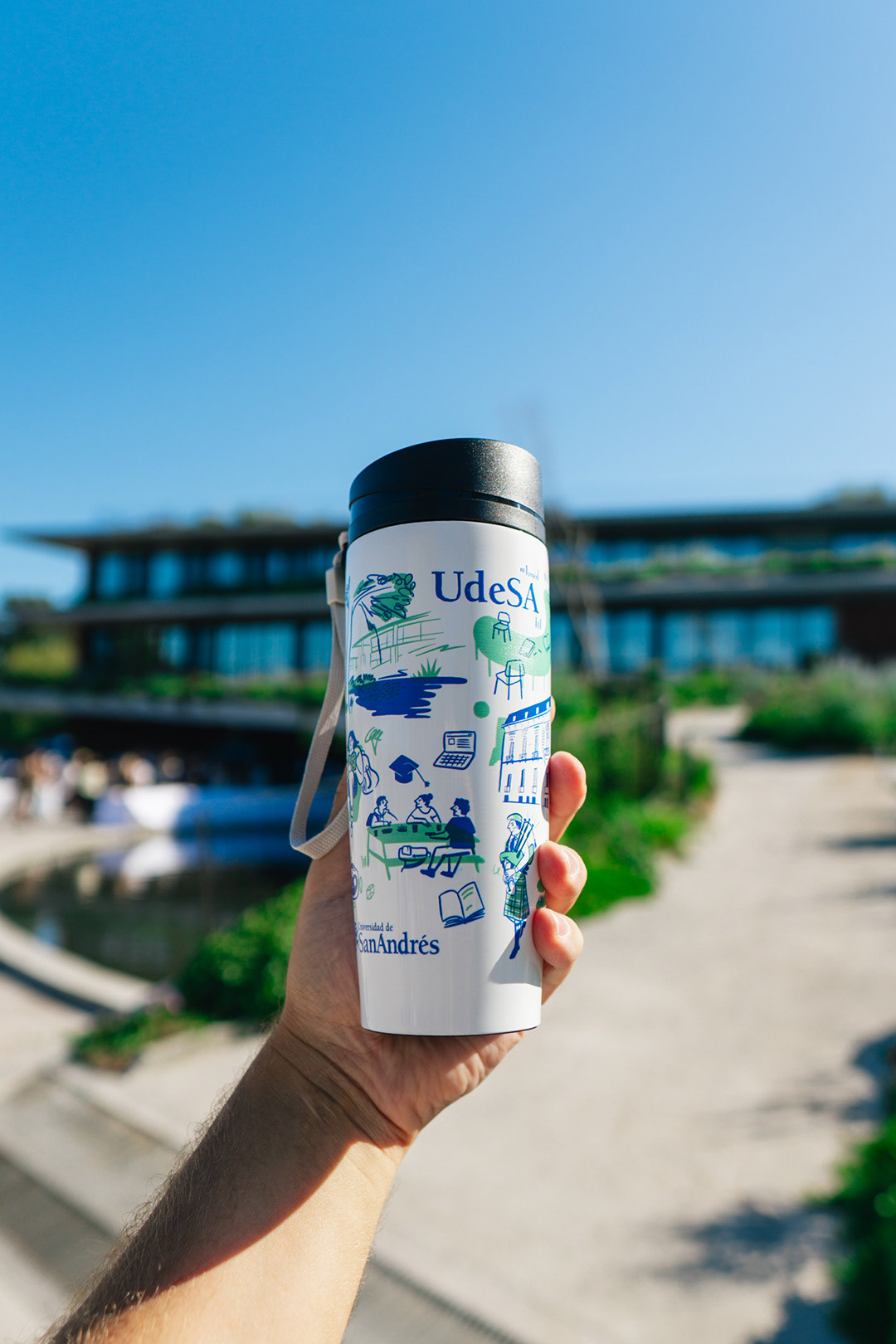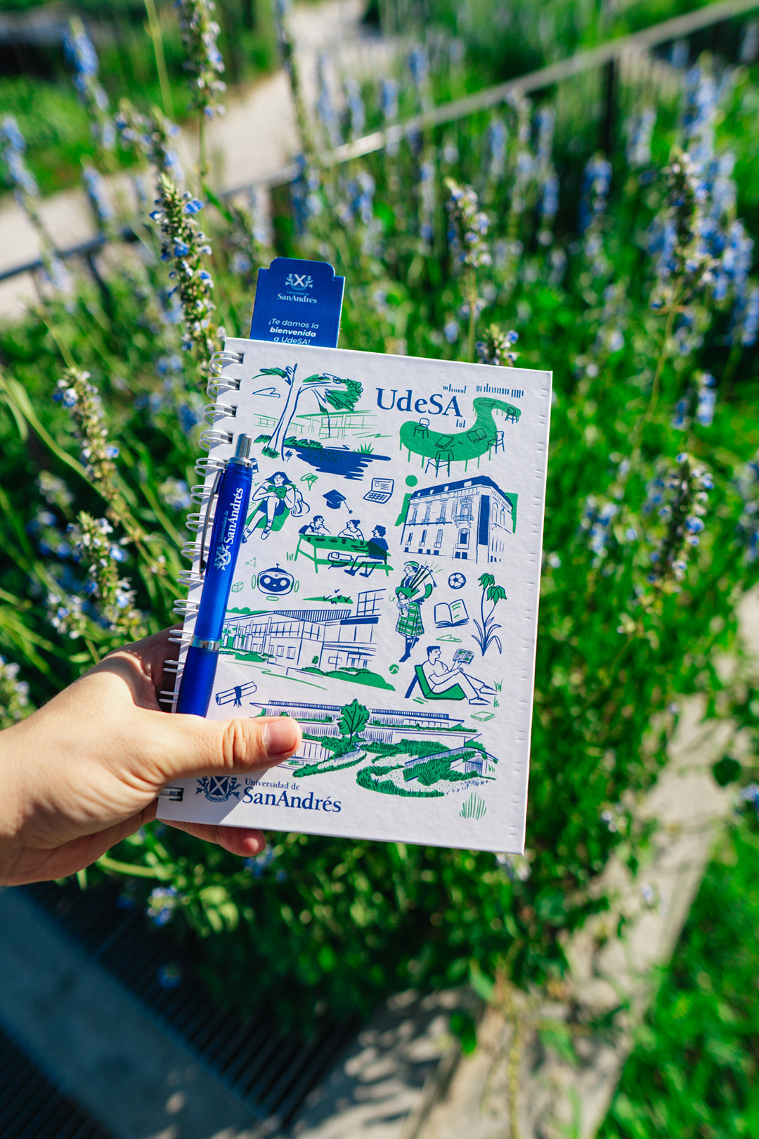 ESP. Kit de bienvenida para estudiantes de UdeSA. Serie de ilustraciones para cuadernos, totebags, stickers, pins, vaso térmico.